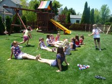 table. Each little honored guest arrived in red, white and blue outfits ready to learn from Leanne different games and crafts she had prepared for them. One British game included “ladders” where the girls put their feet together to look like a ladder. Each team has a runner to jump over the legs and tag the next girl to go. It didn’t matter what