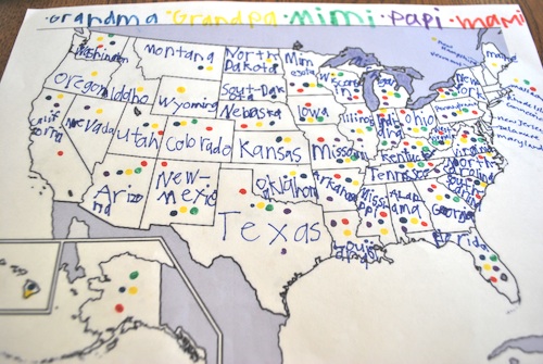 Once they filled in all of the states and begin to learn geography of the states, the fun part began. We skyped with Grandma and Grandpa, and Tia Mimi, and marked a color-coded dot in every state they had visited. This took a while (but was a great learning experience): Grandma would call out a state, and then everyone would have to find it on their map and mark it. I love when kids take polls because it pushes them to be an active participant in the conversation, and to pay attention to the details they are hearing so they can record the answers. We used the data to talk about who had been to the most states, and which states/regions were the most visited. We all decided that we must go to the north and northwest! Next time you have a rainy afternoon, print out a map and have your kids poll your family.